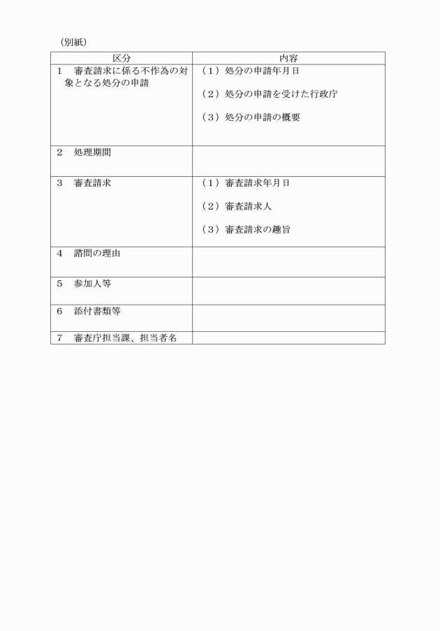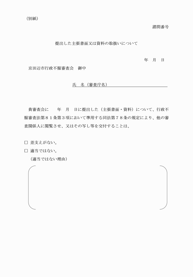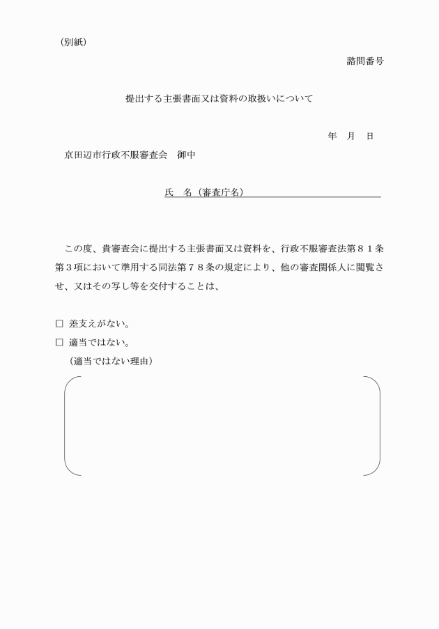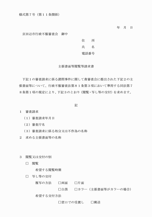 第11条 審査関係人は、法第81条第3項において準用する同法第78条第1項の規定により提出された主張書面等の閲覧又は写し等の交付を求めるときは、審査会に対し主張書面等閲覧等請求書(別記様式第7号)を提出するものとする。