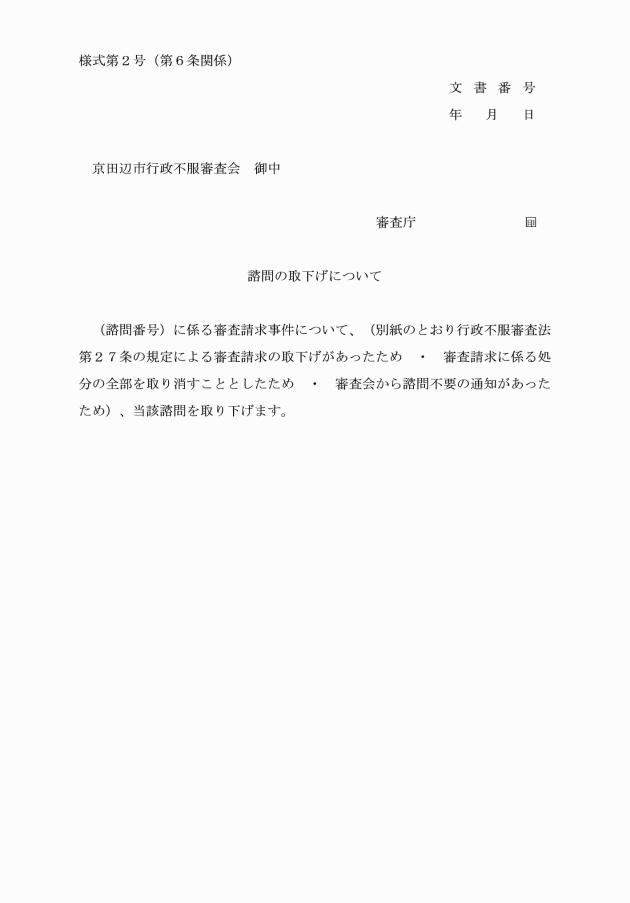 第6条 審査庁は、審査会への諮問を取り下げるときは、別記様式第2号を審査会に提出するものとする。