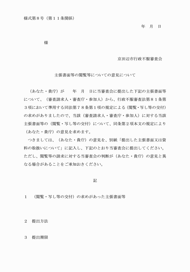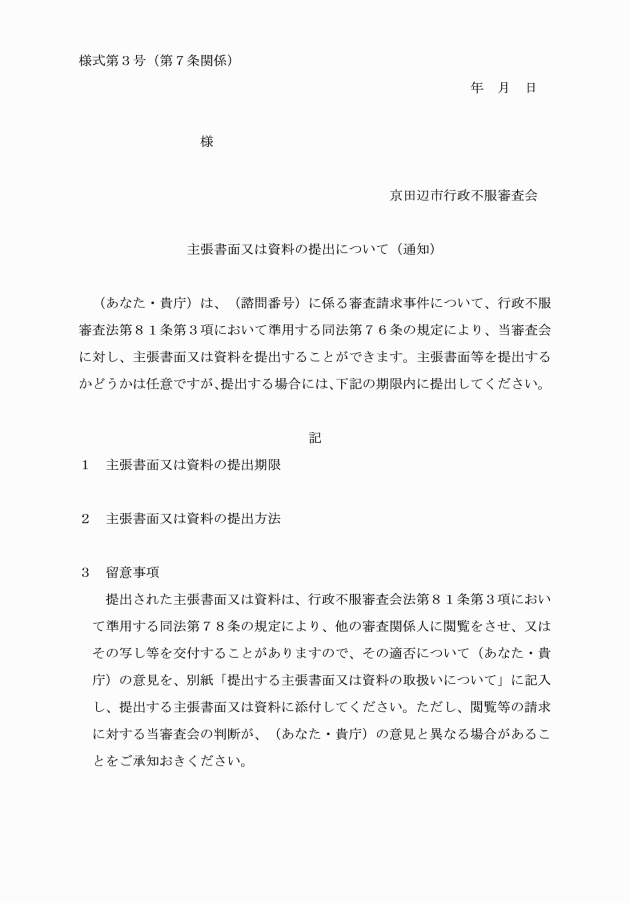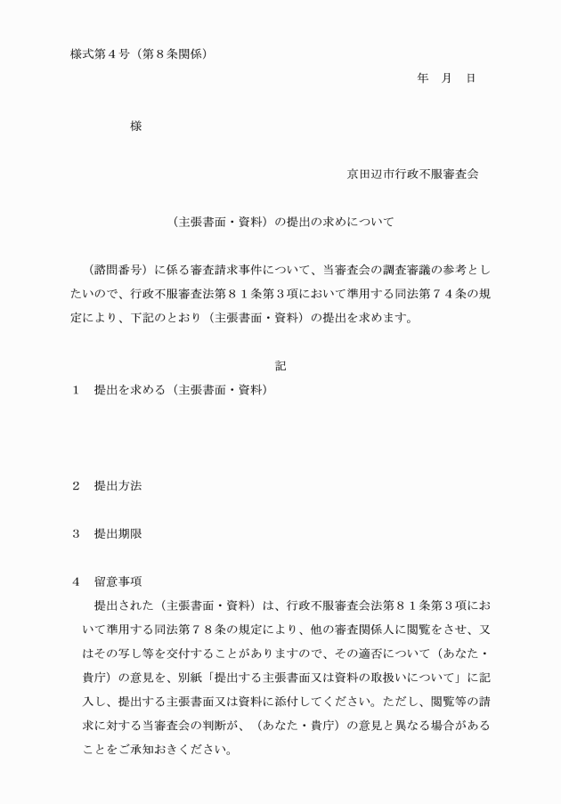 第8条 審査会は、法第81条第3項において準用する同法第74条の規定により、審査関係人に対し主張書面等の提出を求める決定をしたときは、別記様式第4号により通知するものとする。