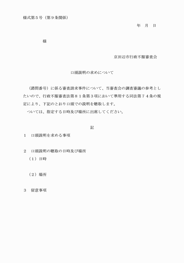 第9条 審査会は、必要があると認めるときは、審査関係人に対し、審査会において口頭での説明を求め、その説明を聴取するものとする。