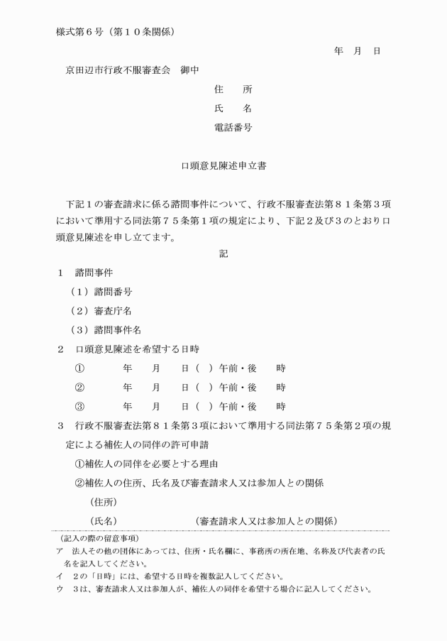 2 審査関係人は、法第81条第3項において準用する同法第75条第1項本文の規定による口頭意見陳述の申立て(同条第2項の規定による補佐人同伴の許可申請を含む。)を口頭意見陳述申立書(別記様式第6号)により行うものとする。