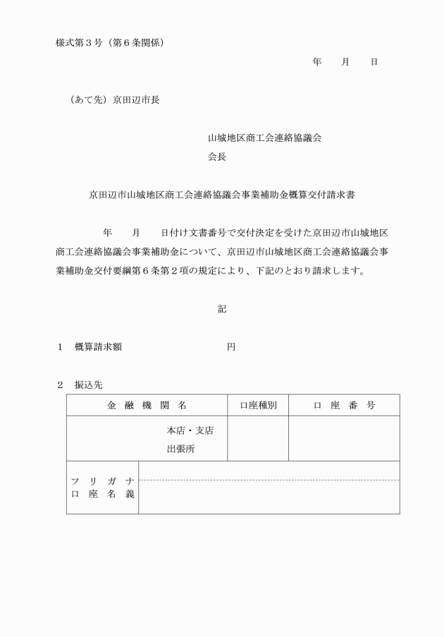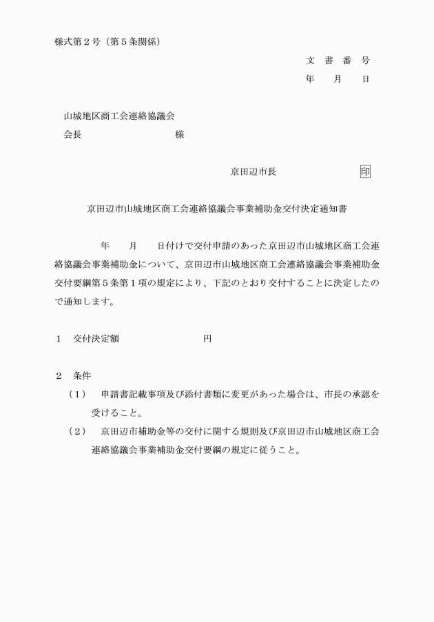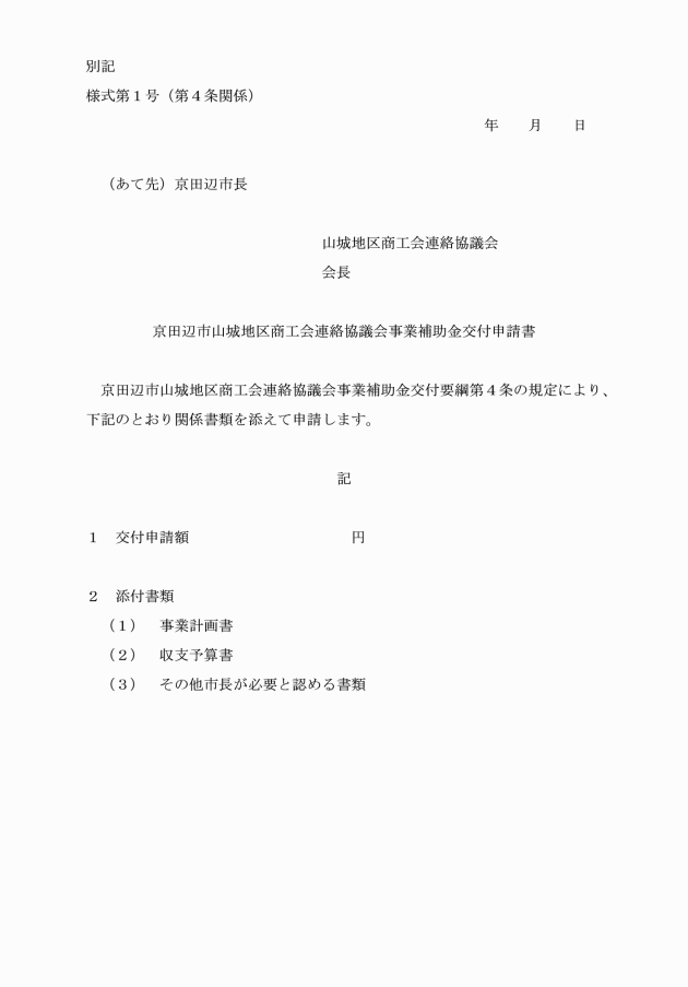 第4条 協議会は、補助金の交付を受けようとするときは、京田辺市山城地区商工会連絡協議会事業補助金交付申請書(別記様式第1号)に次に掲げる書類を添えて、市長に提出しなければならない。