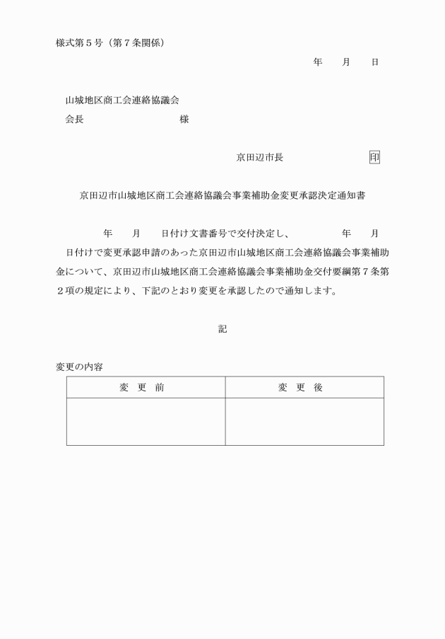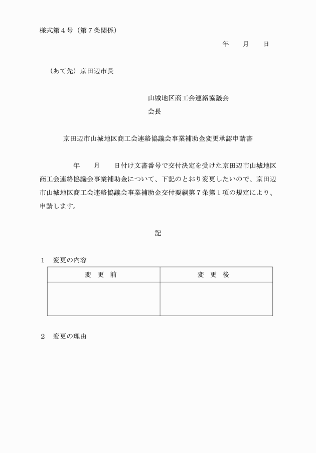 第7条 協議会は、交付申請の内容等を変更しようとする場合は、あらかじめ京田辺市山城地区商工会連絡協議会事業補助金変更承認申請書(別記様式第4号)を市長に提出しなければならない。ただし、事業計画の軽微な変更の場合は、市長と協議し、その指示に従うものとする。