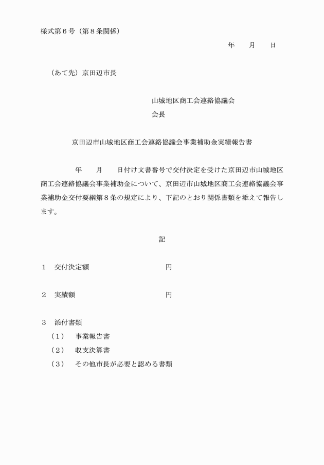 第8条 協議会は、補助事業が完了したときは、速やかに京田辺市山城地区商工会連絡協議会事業補助金実績報告書(別記様式第6号)に次に掲げる書類を添えて、市長に提出しなければならない。