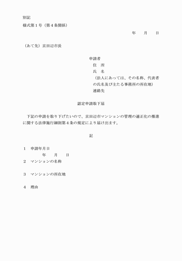 第4条 法第5条の3第1項(法第5条の6第2項において準用する場合を含む。)の規定による申請又は法第5条の7第1項に規定する変更の申請(以下これらを「申請」という。)をした者(以下「申請者」という。)は、市長が法第5条の4の規定による認定(法第5条の6第2項又は法第5条の7第2項において準用する場合を含む。以下「認定」という。)をする前に申請を取り下げようとするときは、認定申請取下届(別記様式第1号)を市長に提出しなければならない。