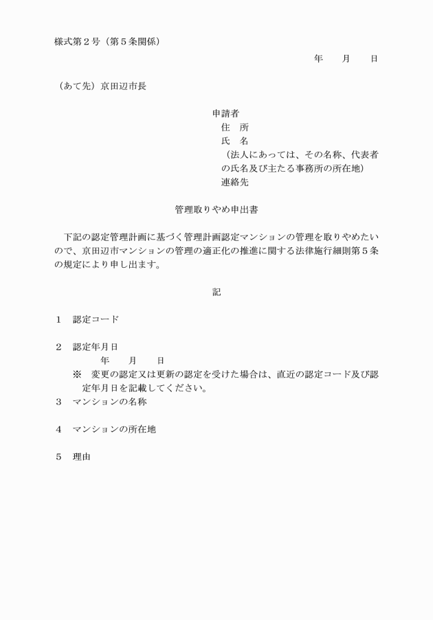 第5条 認定管理者等は、法第5条の10第1項第2号に規定する申出をしようとするときは、管理取りやめ申出書(別記様式第2号)を市長に提出しなければならない。