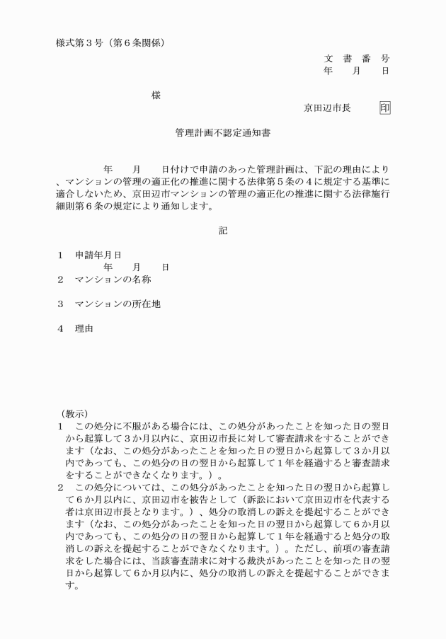 第6条 市長は、認定をしないときは、管理計画不認定通知書(別記様式第3号)により申請者に通知するものとする。