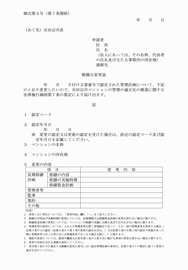 第7条 認定管理者等は、省令第1条の9に規定する軽微な変更をしようとするときは、軽微な変更届(別記様式第4号)に当該変更の内容が分かる書類を添えて、市長に提出しなければならない。