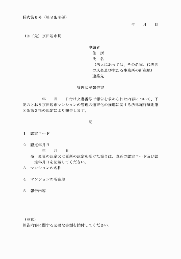 2 認定管理者等は、報告を求められたときは、管理状況報告書(別記様式第6号)に必要な書類を添えて市長に提出しなければならない。