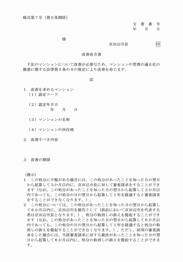 第9条 市長は、法第5条の9の規定による命令を改善命令書(別記様式第7号)により行うものとする。