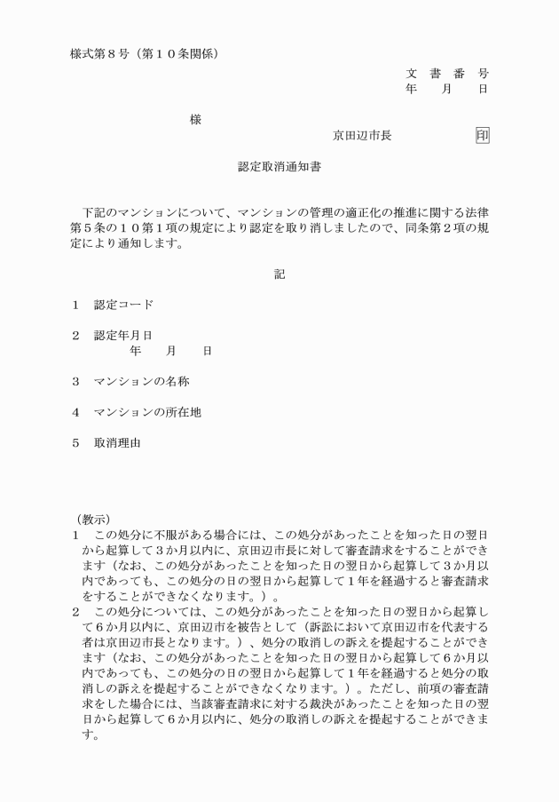 第10条 市長は、法第5条の10第2項の規定による通知を認定取消通知書(別記様式第8号)により行うものとする。