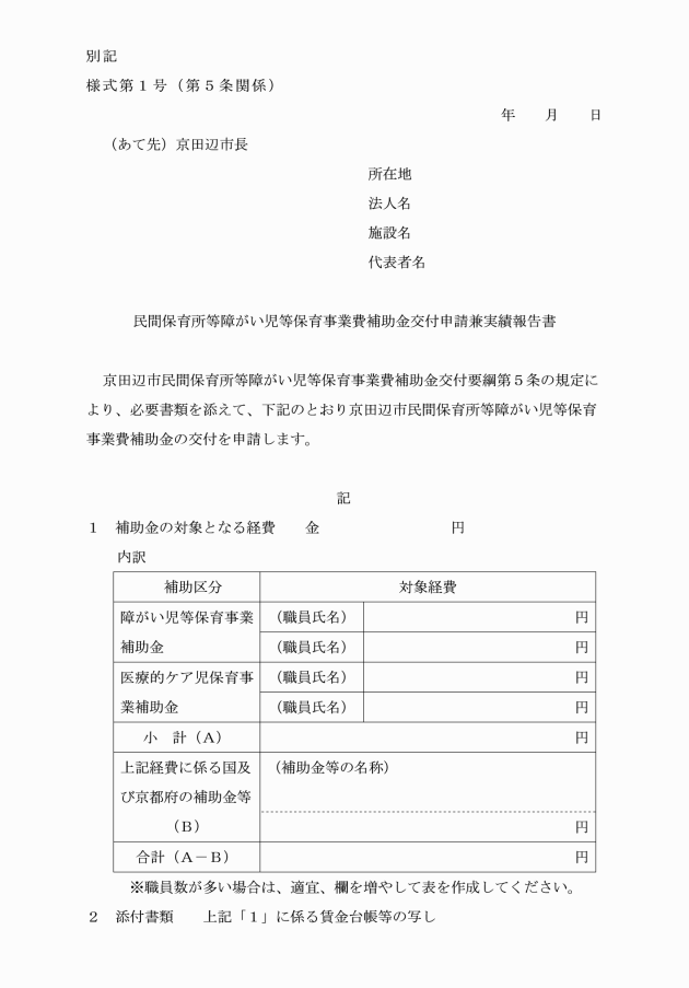 第5条 補助金の交付を受けようとする者(以下「申請者」という。)は、市長が別に定める日までに、民間保育所等障がい児等保育事業費補助金交付申請兼実績報告書(別記様式第1号)に加配職員に係る賃金台帳等の写しその他の対象経費の実支出額を証明する書類を添えて、市長に提出しなければならない。