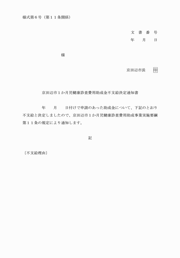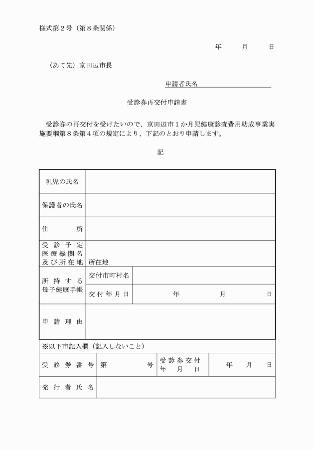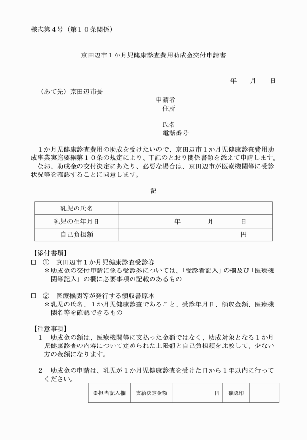 第10条 償還払の方法により助成金の交付を受けようとする助成対象者(以下「申請者」という。)は、1か月児健康診査対象者が1か月児健康診査を受診した日から1年以内に、京田辺市1か月児健康診査費用助成金交付申請書(別記様式第4号)に次に掲げる書類を添えて、市長に提出しなければならない。