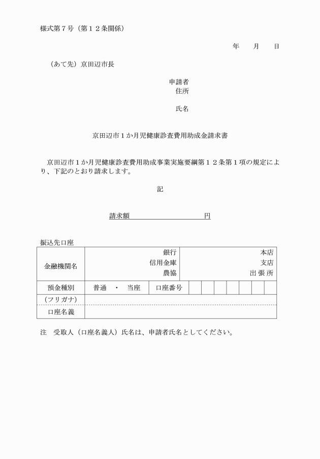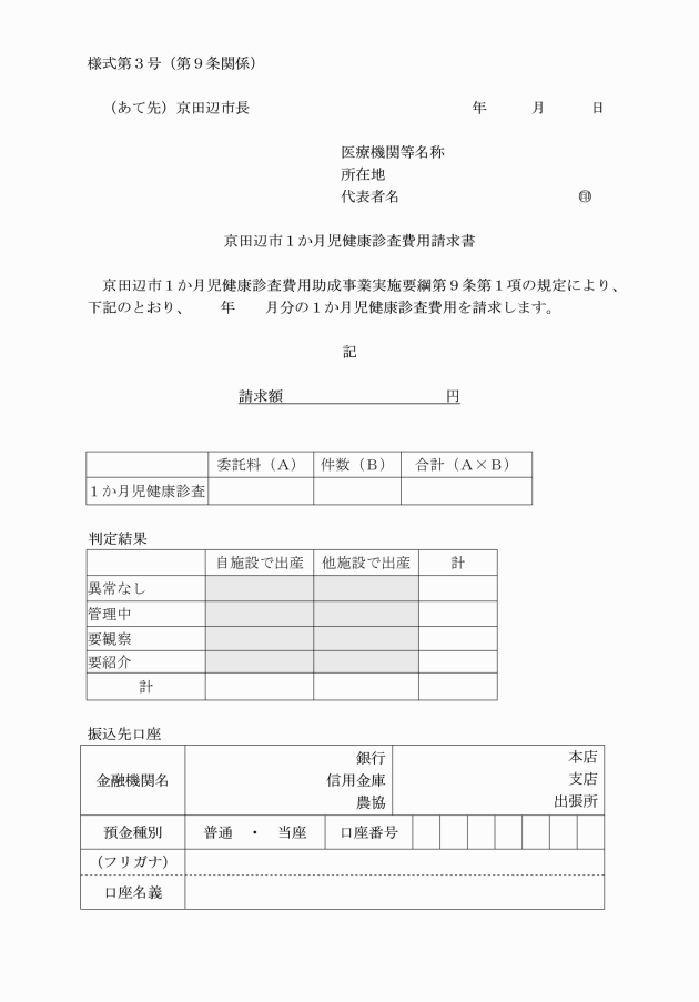 第9条 委託医療機関等は、助成金を請求しようとするときは、京田辺市1か月児健康診査費用請求書(別記様式第3号)に受診券を添付し、市長に提出しなければならない。
