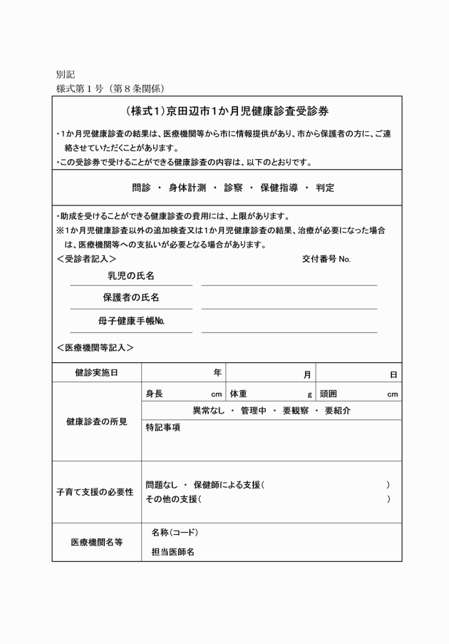 第8条 市長は、助成対象者に対し、京田辺市1か月児健康診査受診券(別記様式第1号。以下「受診券」という。)を1か月児健康診査対象者1人につき1枚交付するものとする。